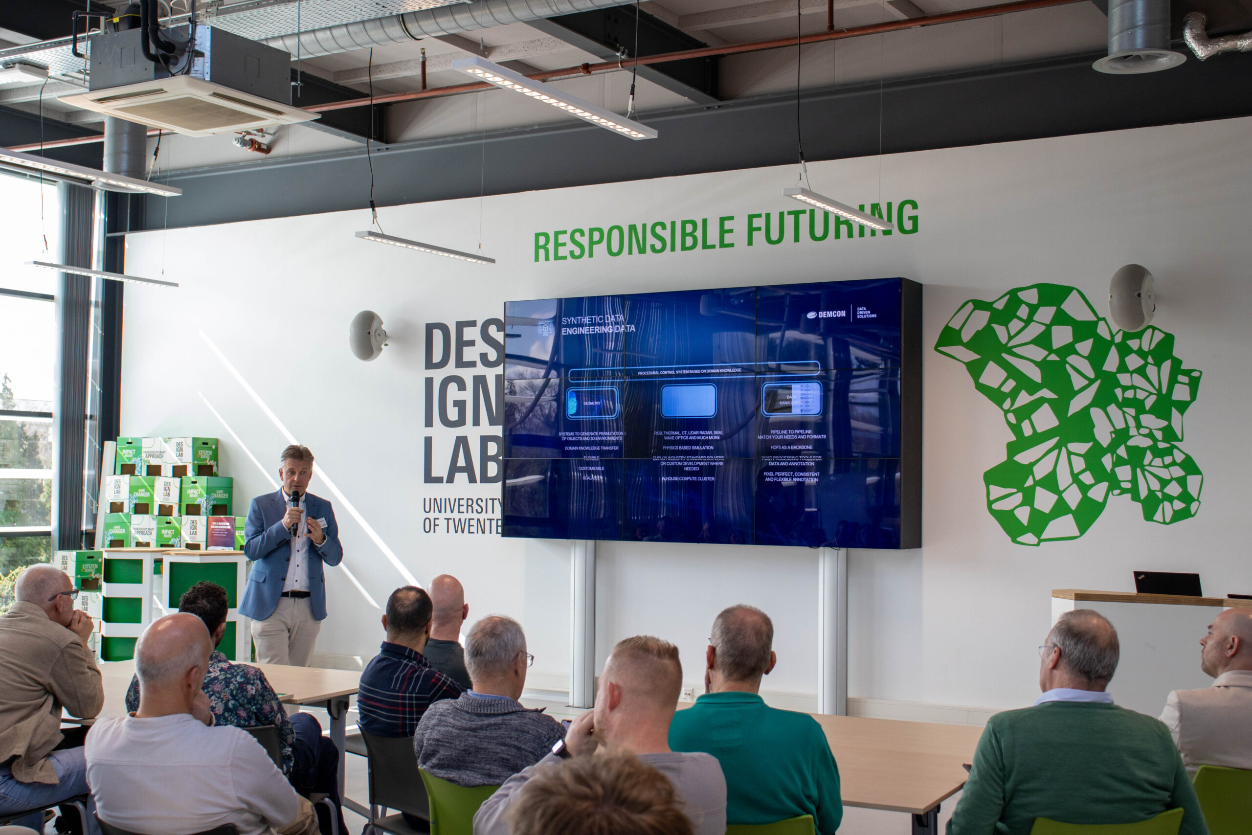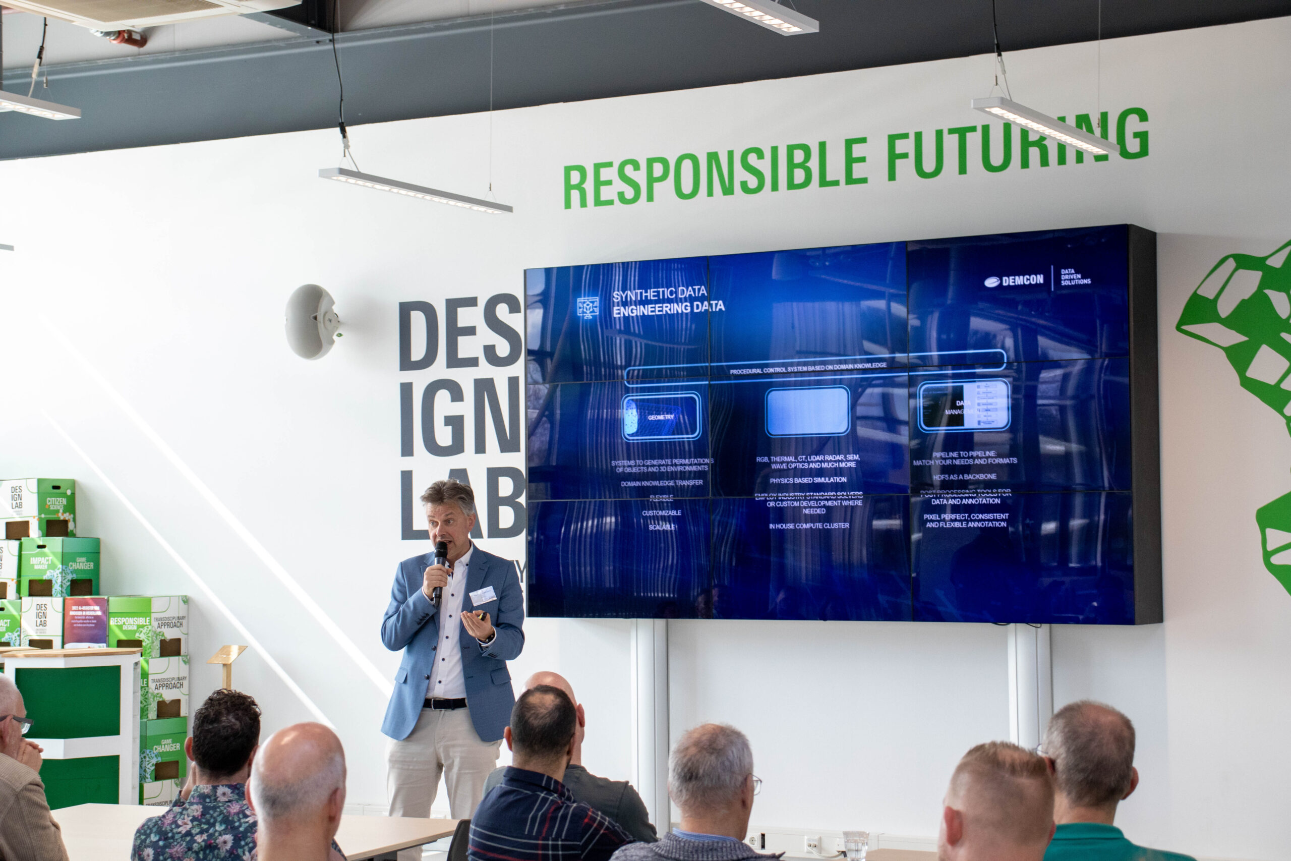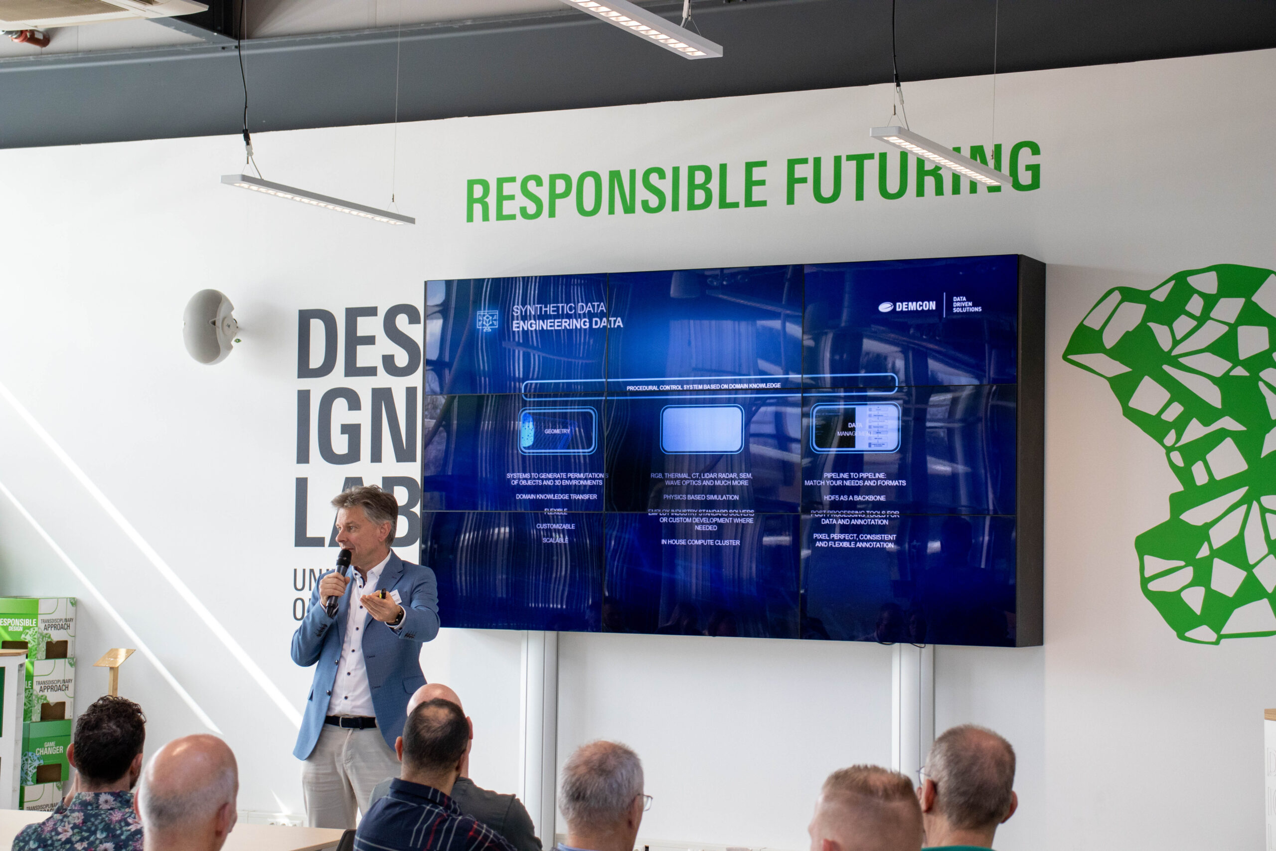 Marnix Zoutenbier opende de dag met een presentatie over synthetische data bij Demcon Data Driven Solutions (DDDS). Hier genereren engineers dagelijks samen met AI synthetische data, bijvoorbeeld voor medische toepassingen of defensie. Anders dan generatieve AI, waarbij vaak alleen een ‘platte’ afbeelding ontstaat, biedt de gegenereerde synthetische data van DDDS volledig inzicht over onderliggende informatie en variatie. Dit maakt het toevoegen van zeldzame gevallen mogelijk en zorgt zo voor een uitgebreide en relevante dataset. Hieruit blijkt dat de juiste informatie op het juiste moment ontzettend belangrijk is!