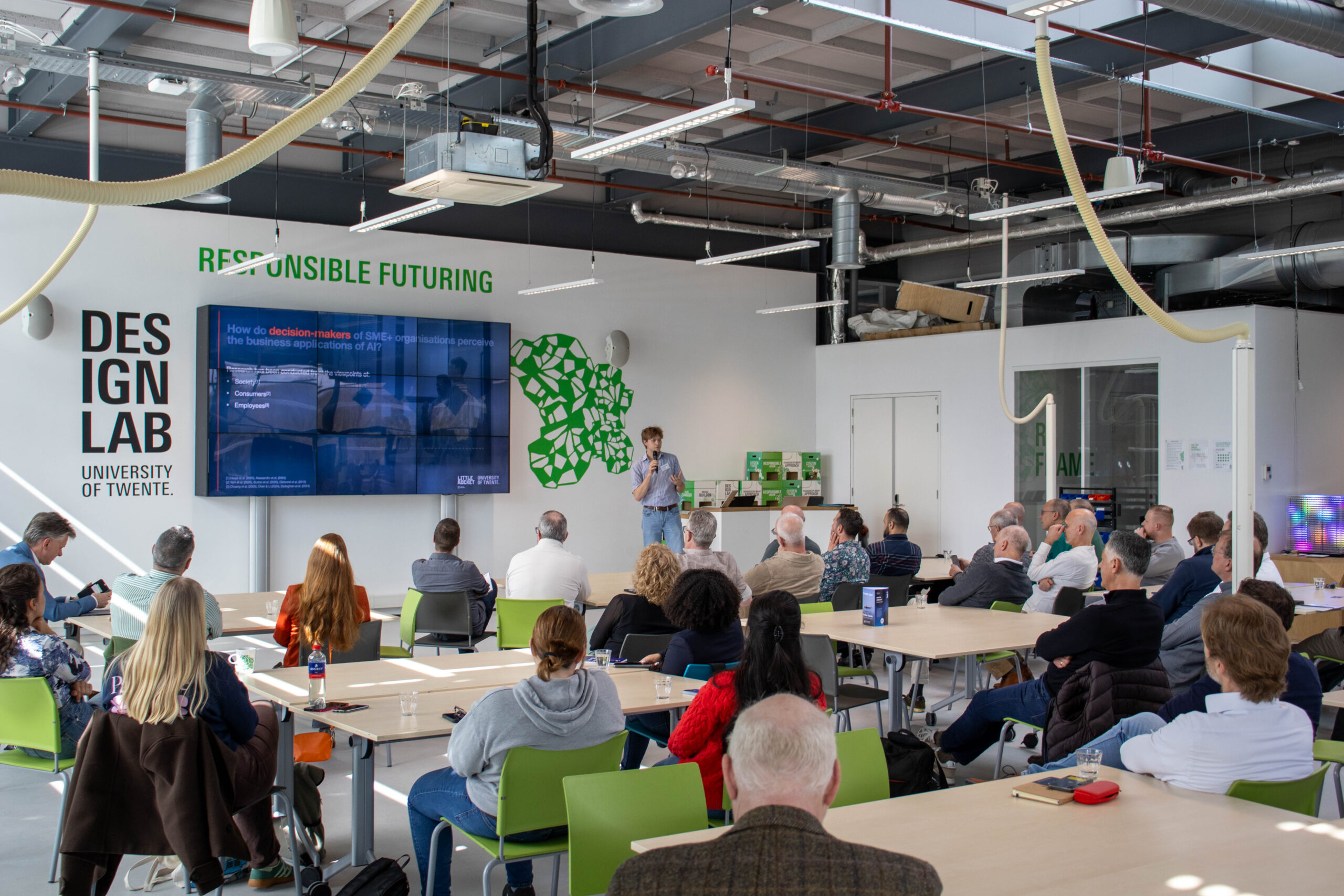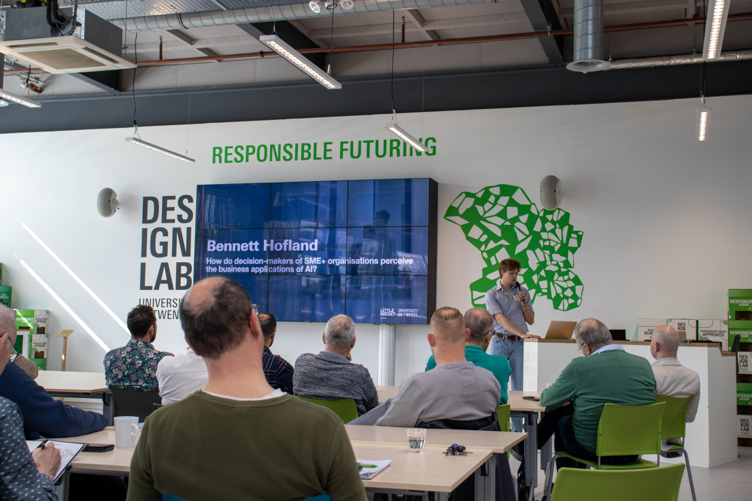 Waar DDDS al vooroploopt met AI, geldt dit niet voor alle bedrijven, liet Bennet Hofland ons weten. Hij onderzocht in zijn scriptie het sentiment rondom AI in kleine bedrijven. Hij sprak beslismakers en vergeleek hun opvattingen met de bestaande literatuur. Wat opviel, is dat elk voordeel van AI direct een nieuw vraagstuk oproept. Zo kan AI taken overnemen en kosten besparen, maar vereist het ook nieuwe investeringen in expertise. Bennet bracht op deze manier meerdere paradoxen aan het licht. Zijn conclusie: het MKB kan niet bijbenen met grote bedrijven om AI effectief en efficiënt in te zetten.