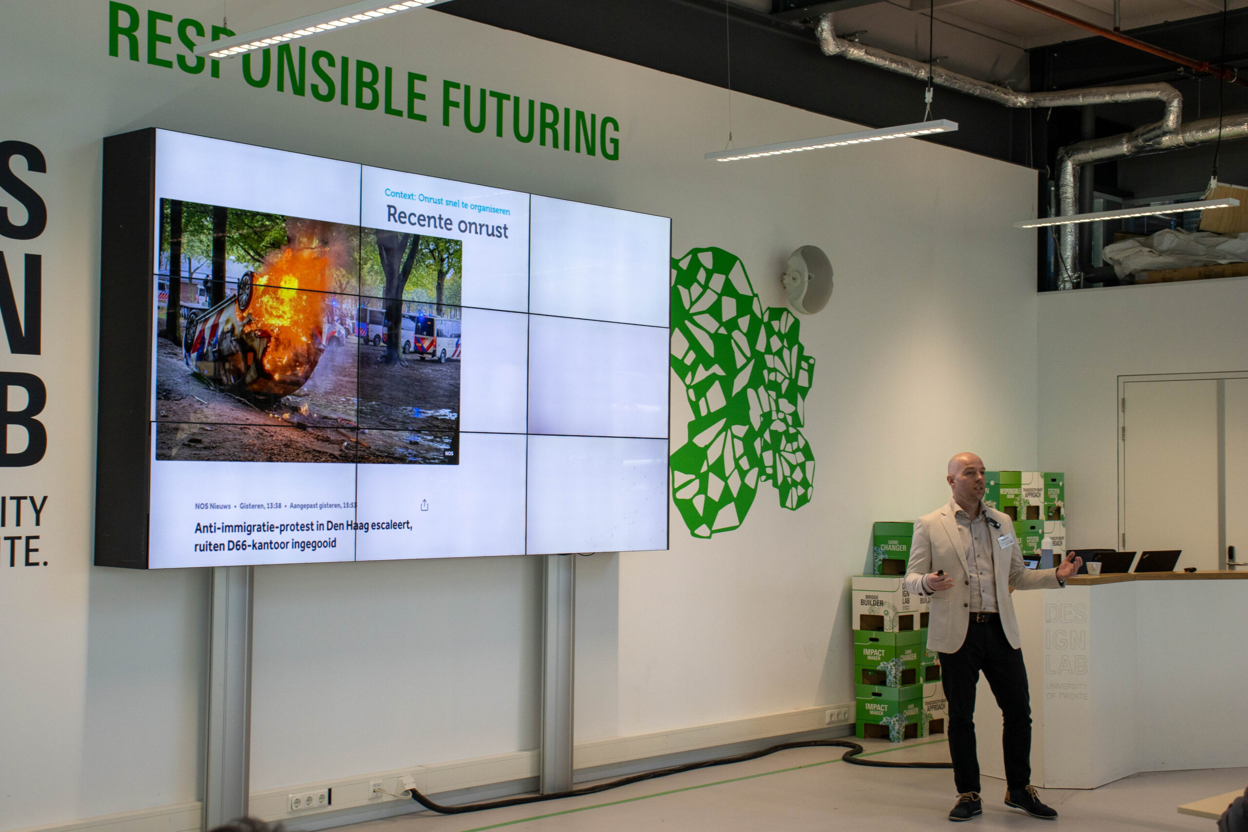 Matthijs Film deelde zijn ervaringen bij de politie, waar het snel en accuraat delen van informatie cruciaal is bij kritieke situaties. Achter de schermen staat een team klaar dat aan de hand van diverse data de juiste beslissingen neemt. In zijn onderzoek richtte Matthijs zich op het verbeteren van de informatievoorziening, zodat per beslissing de juiste relevante data gebruik wordt. Zoals Matthijs dat gevat zei: ‘minder schermen, meer beeld’. Iets dat in kennisoverdracht ook enorm belangrijk is!
